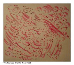 In 1986, I got to know calligraphy under the care of Mr. Mohammad-Zaman Farasat in the township of Babol, North city of IRAN. In 1987, I attended in art exhibition for medical student – painting section – and got to know two of the most well-known calligraphers of Babol, Mr. Mehdi Pourvatan and Mr. Kamran Kouhestani, and later they became of my best friends. Since calligraphy is involved with literature, poem and painting, it makes me feel a deep tendency to the poems of famous poets of my territory, IRAN. So I read most of the complete works of these poets in my leisure time. The effects of these poems and my own interest came together and makes me compose poems. I read my first poem in the “Night of poem” for students in Babol city in front of Mr. Mehrdad Avesta and Mr. Hamid Mosadegh (Two famous poets.)