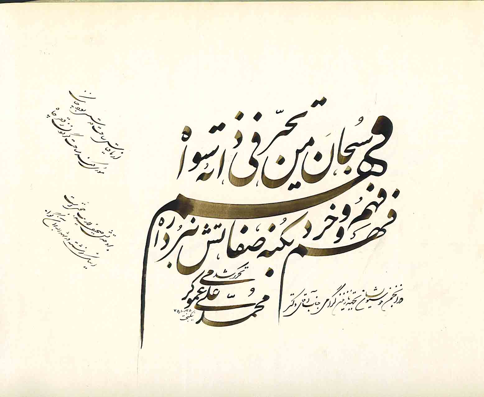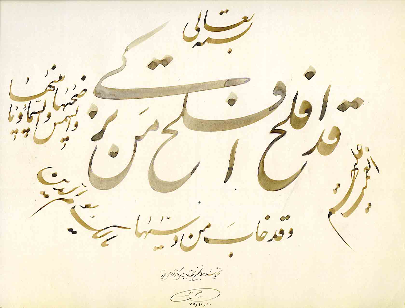 In 1986, I got to know calligraphy under the care of Mr. Mohammad-Zaman Farasat in the township of Babol, North city of IRAN. In 1987, I attended in art exhibition for medical student – painting section – and got to know two of the most well-known calligraphers of Babol, Mr. Mehdi Pourvatan and Mr. Kamran Kouhestani, and later they became of my best friends. Since calligraphy is involved with literature, poem and painting, it makes me feel a deep tendency to the poems of famous poets of my territory, IRAN. So I read most of the complete works of these poets in my leisure time. The effects of these poems and my own interest came together and makes me compose poems. I read my first poem in the “Night of poem” for students in Babol city in front of Mr. Mehrdad Avesta and Mr. Hamid Mosadegh (Two famous poets.)